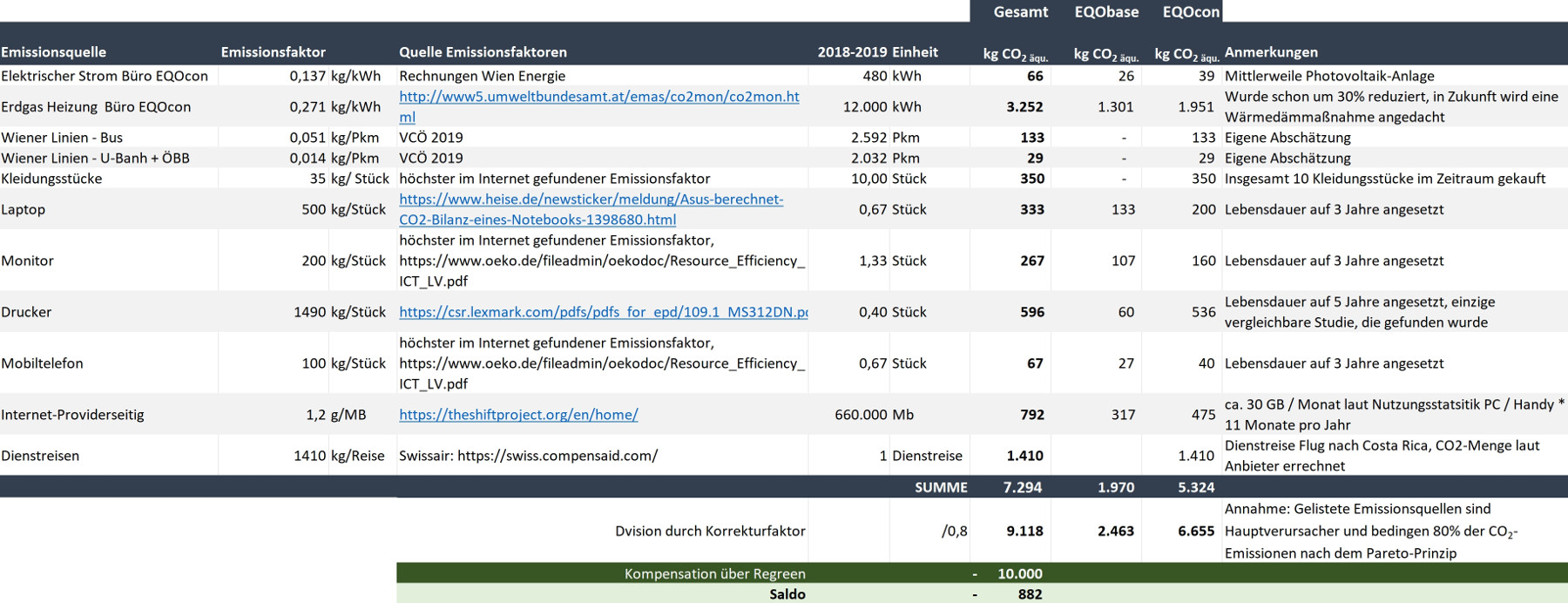 Daten über den realen Ausstoß an Treibhausgasen für die Produktion von EQObase wie auch der Beratungsdienstleistungen von EQOcon sind schwierig abzuschätzen. Die Hersteller bzw. Lieferanten geben in der Regel keine Informationen darüber an. In nebenstehender Tabelle ist daher der Versuch einer plausiblen Abschätzung der CO2-Emissionen von EQOcon und EQObase ersichtlich.